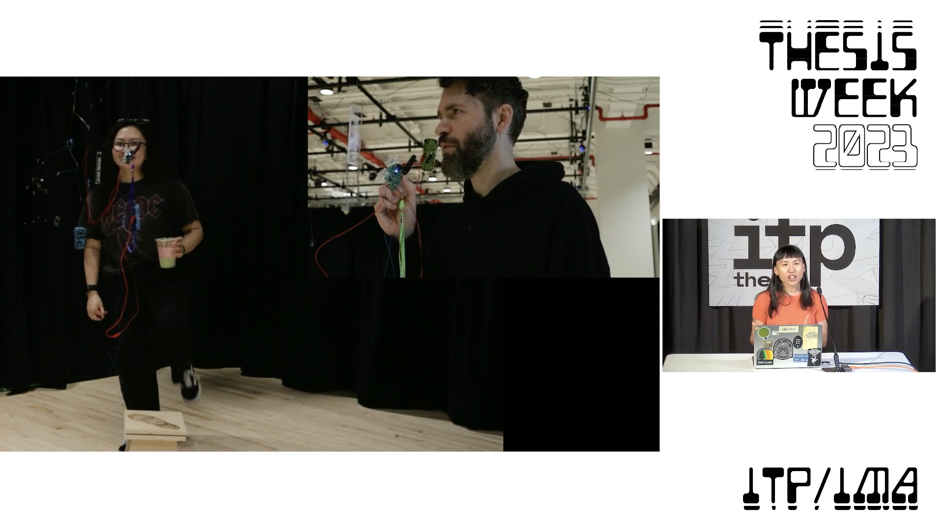 mixed media: 2 distinct separate spaces, 2+ people, wire, plastic,